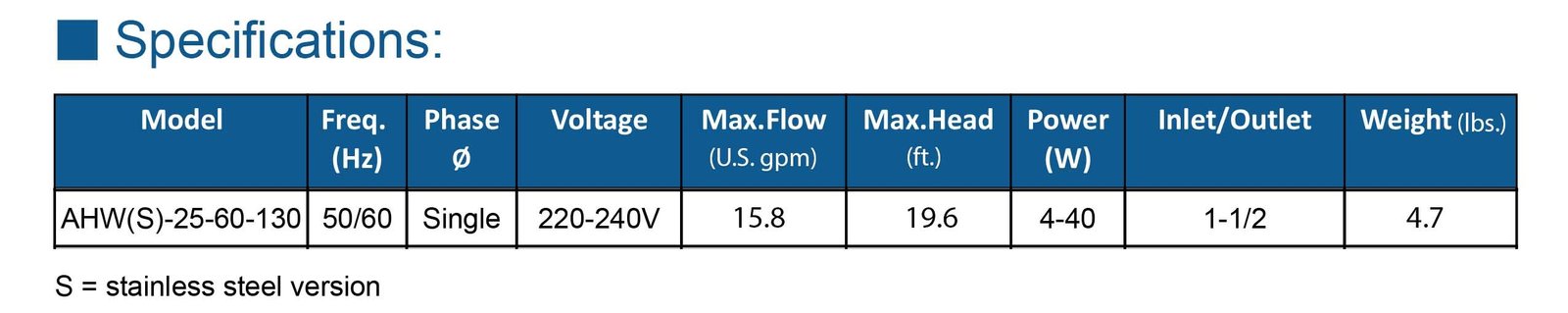 AHW 25-60-130 – Hot Water Circulator Pump (Stainless Steel 304) – 50/60Hz