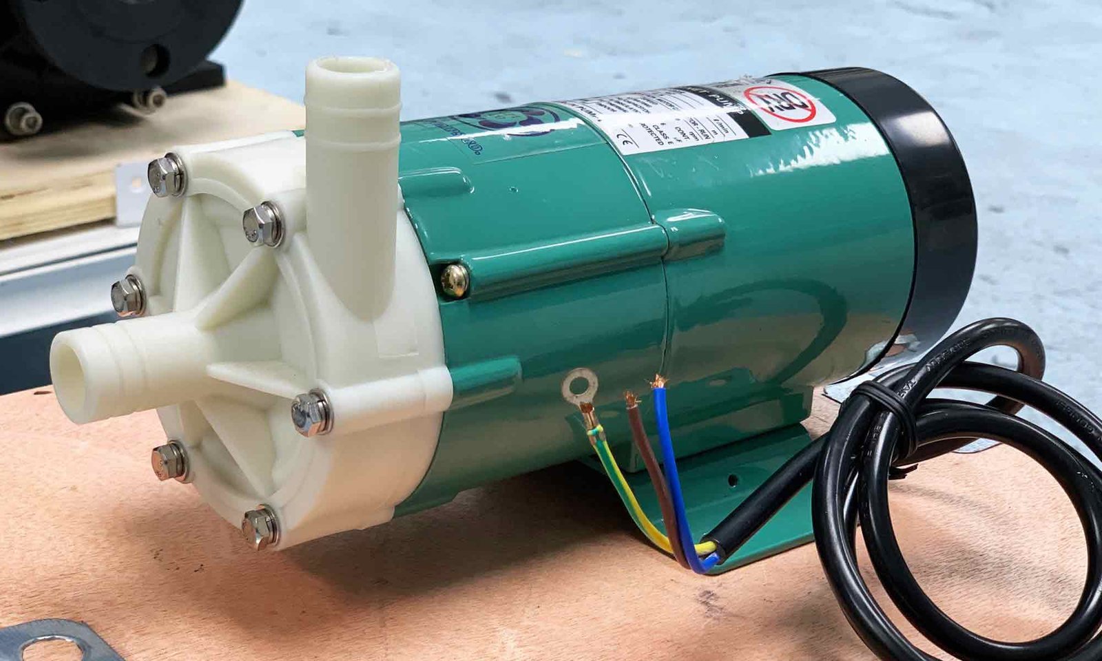 These magnetic drive pumps are designed to circulate mildly corrosive acids, alkalis, solvents, brines, plating solutions, sterile solutions, and other mildly corrosive chemicals and solutions that are compatible with the pump’s material of construction. The design isolates the pump mechanism from the motor with a solid wall. Liquid surrounds the pump, which has no physical connection to the motor. Magnets on both sides of the wall transmit rotary power from the motor side to the pump.