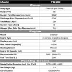 The TG20 has a 4-stroke 196cc OHV engine that pumps water and debris up to 9/16 in. size. Also features tubular steel frame, 8 in. Never Flat tires and foldaway handle. It has a delivery volume of 158 GPM and 0.9 gallon fuel capacity.