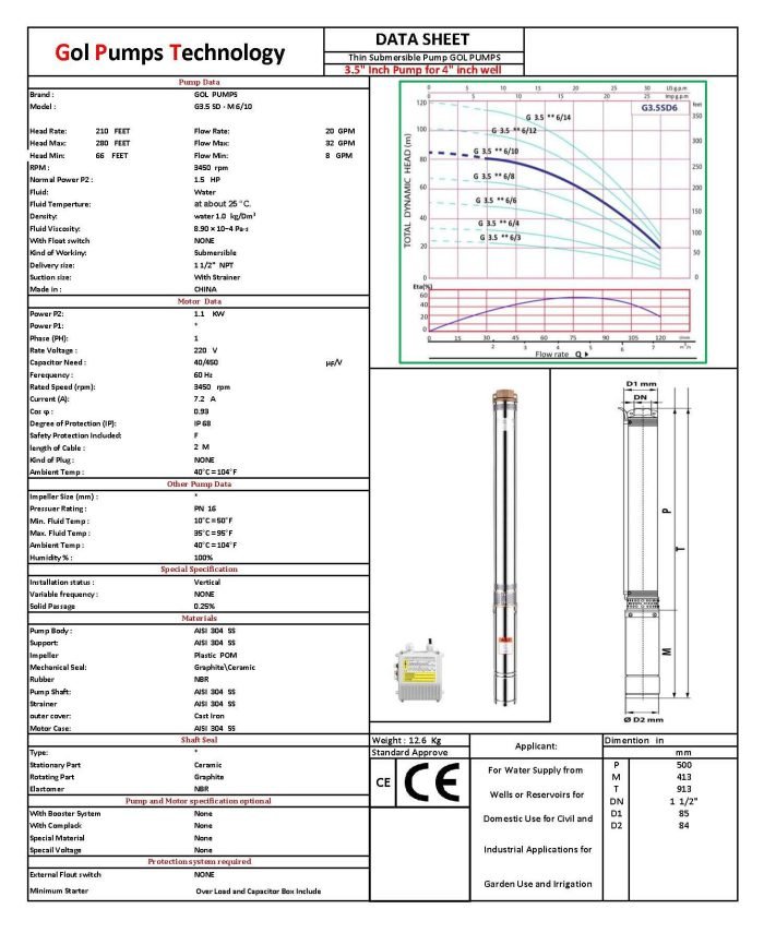 This 3.5″ thin submersible pump from GOL Pumps can be used for water supply in wells and reservoirs. It can reach a up to 280 feet of head and is a great fit for 4″ diameter wells.