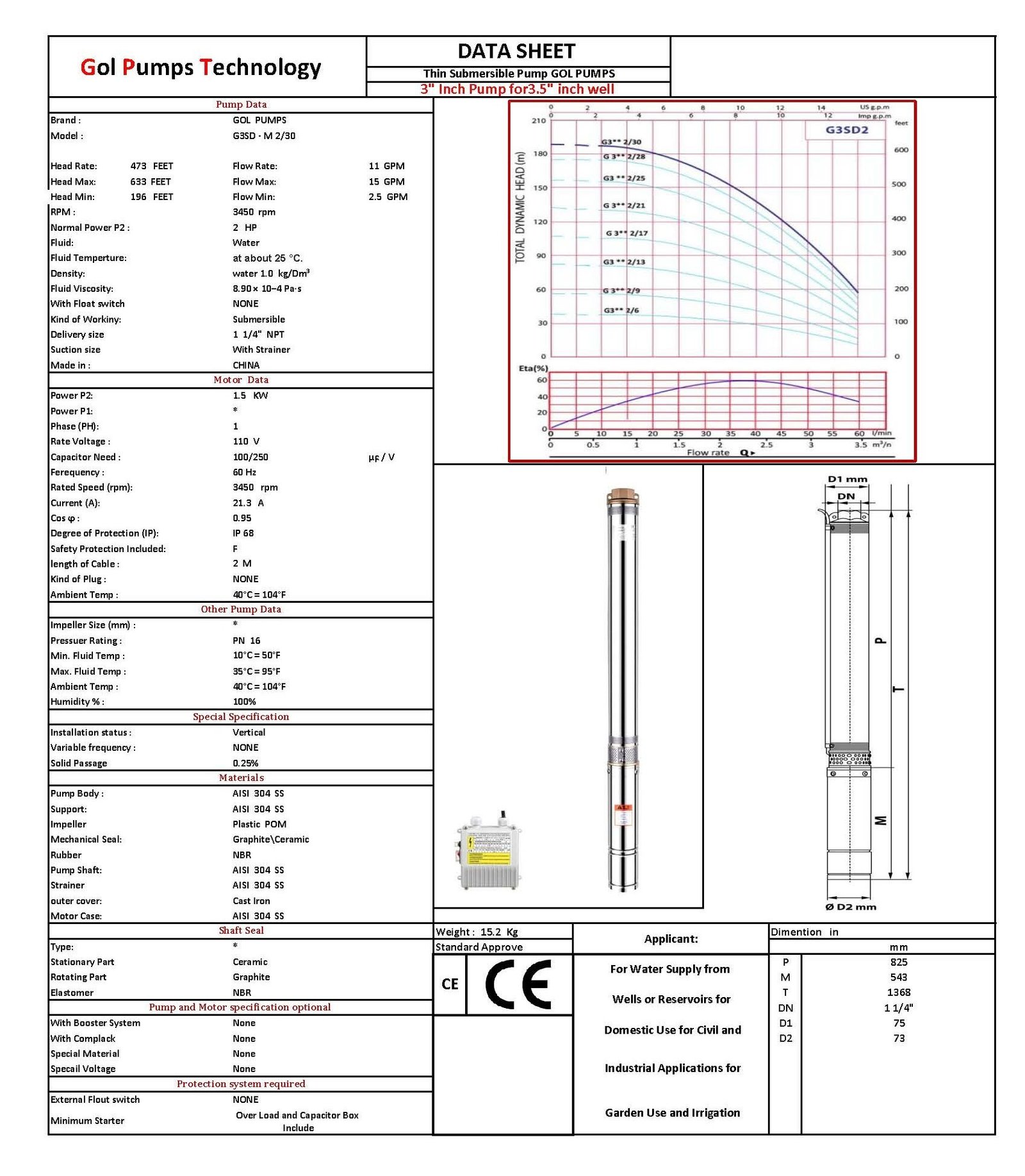 Gol Pumps 3.5″ Thin Submersible Well Pump – 390Ft – 1890 GPH – 3 Wire – 2HP