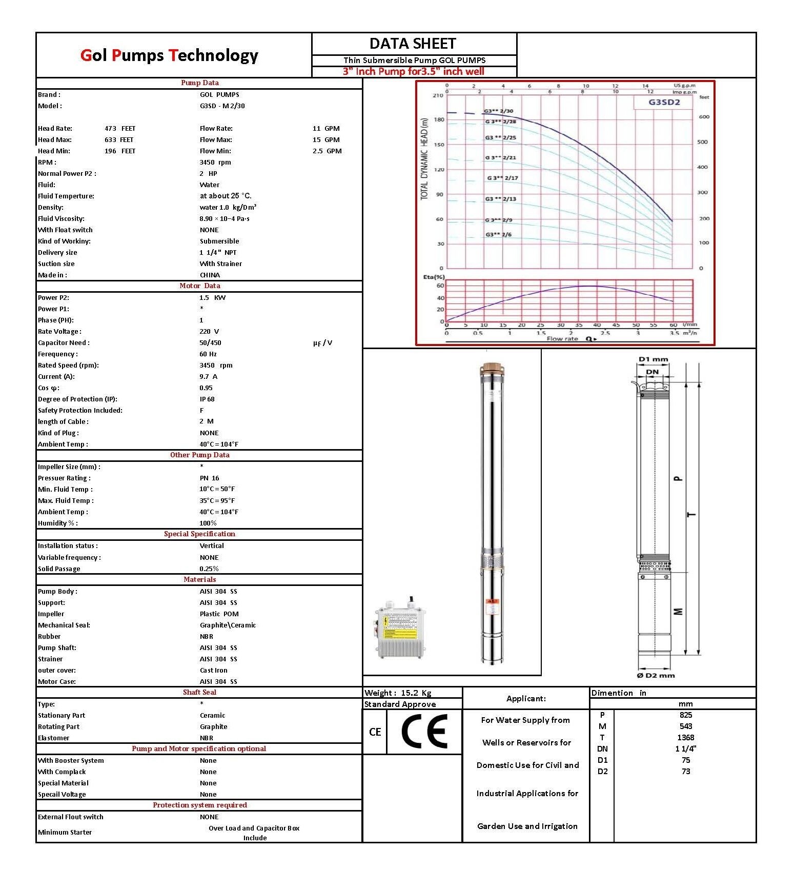 Gol Pumps 3″ Thin Submersible Well Pump – 633 Ft – 942 GPH – 3 Wire – 110/220V – 2HP