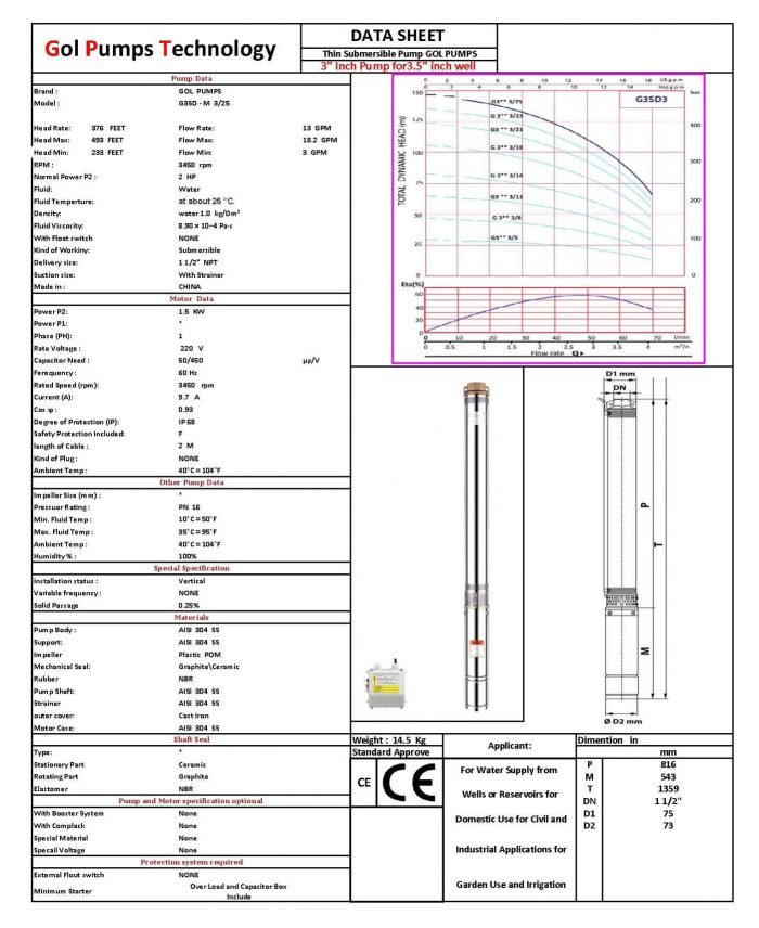 This 3″ thin submersible well pump from GOL Pumps can be used for water supply in wells and reservoirs. It can reach a up to 493 feet of head and is a great fit for 3.5″ diameter wells.